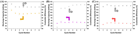Galvanostatic cycling of half cells using an IG SSE. (A) Conventionally cast LTO vs. Li cycling at C/5. (B) Composite LTO vs. Li cycling at C/5 rate. (C) LTO vs. LFP cycling at C/5 rate. Arrows point to axis associated with data, solid to discharge capacity, and unfilled to Coulombic efficiency.