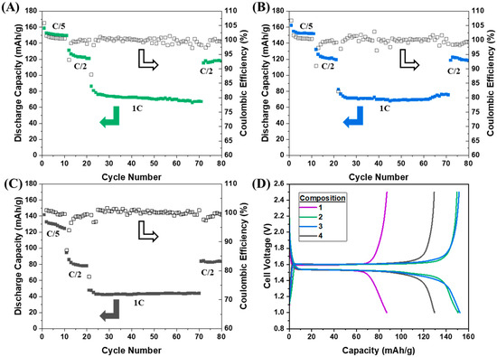 Composition 4 did not achieve as high of capacities at any point when compared to compositions 2 and 3. These latter compositions started with lower capacities in comparison and dipped to even lower utilizations at higher current densities. While this cell was also able to cycle at a 1C rate, the authors believe the lower amount of conductive carbon compared to compositions 2 and 3 makes the electrodes unable to obtain high capacities under higher current loads. Although the utilization was lower, the composite electrode had an average Coulombic efficiency of 99.77% for cycles 2–80. This is slightly larger than for composition 1 (99.68%) but lower than for compositions 2 and 3 (99.88 and 99.86, respectively). As seen in Figure 4D, even with reduced capacities, the voltage profile of compositions 1 and 4 was similar to that of compositions 2 and 3 at a C/5 rate, indicating that iR effects were not responsible for the loss of capacity in compositions 1 or 4. All displayed a flat discharge plateau at ~1.53 V vs. Li.