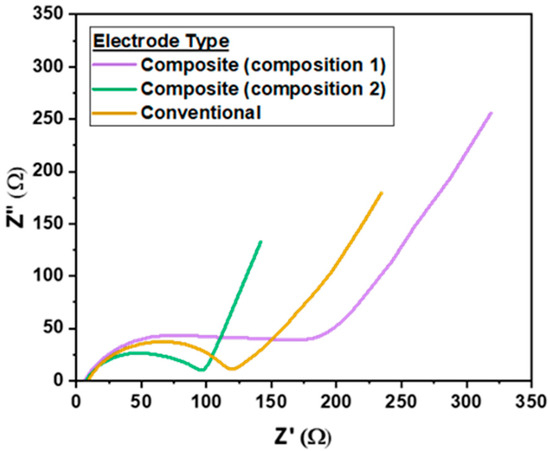Electrochemical impedance spectroscopy (EIS) was then used on selected cells to help explain the galvanostatic cycling performance differences observed. In the Nyquist plots seen in Figure 5, there is clearly an impact on cell resistance and capacitance depending on the amount of IG SSE included (or not) in the LTO electrode formulation. From an impedance perspective, the worst cell is the composition 1 LTO electrode, which has the largest charge transfer resistance and capacitance, which is surmised from the theoretical Z’ intercept of the right portion of the semicircle and the maximum Z” of the semicircle, respectively [24,25]. The elongated semicircle feature in this curve likely arises from multiple electrochemical interfaces being produced from the high ionogel content in the composite electrode. The EIS of the conventional LTO electrode in a Li half cell with an IG SSE had a similar maximum capacitance but lower charge transfer resistance than the cell with a composition 1 anode. The composition 2 LTO in comparison had the best EIS properties, with lower charge transfer resistance and decreased capacitance. The overall lower impedance of composite 2 is likely responsible for creating the conditions the cell needs to have near-theoretical capacity utilization at C/5, where composition 1 and the conventional electrode are hindered by poor ion and electron transport.