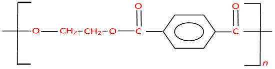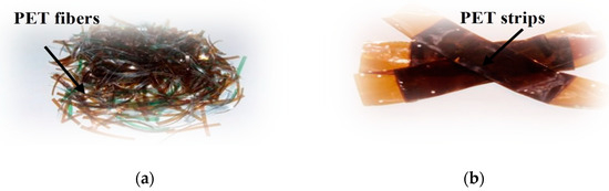 PET, a thermoplastic polymer, is widely recognized for its recyclability and has gained global significance due to its extensive range of plastic applications. The chemical structure of PET, represented in Figure 2, depicts the arrangement of its repeating units, with ‘n’ representing the number of these units. PET fibers and strips possess several important structural properties. The ethylene glycol units (-O-CH2-CH2-O-) are connected by ester linkages to the terephthalic acid units (-C6H4-CO-O-), forming a linear chain [35]. The ester linkages are formed through a condensation reaction between the hydroxyl groups of ethylene glycol and the carboxyl groups of terephthalic acid [36]. This chemical structure gives PET its notable properties. The presence of the ester linkages contributes to PET’s high strength, durability, and thermal stability. The polymer chains are closely packed, creating a rigid and crystalline structure, which further enhances PET’s mechanical properties [37]. The chemical structure of PET also enables its excellent barrier properties, making it resistant to moisture, gases, and chemicals. This property makes PET a preferred material for packaging applications, as it helps to protect and preserve the contents of various products [38]. Furthermore, the presence of the aromatic ring in the terephthalic acid units enhances PET’s chemical resistance and makes it less susceptible to degradation from ultraviolet (UV) light exposure, providing it with good UV stability [39].
