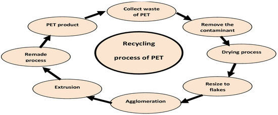 The conventional recycling process of PET is shown in Figure 4. The conventional PET recycling process begins with the collection of used PET products, such as plastic bottles, from recycling bins or dedicated collection points [55,56]. Once collected, the PET items undergo sorting to separate them from other types of plastics. This ensures the purity of the recycled PET material. Following sorting, the PET is thoroughly cleaned to eliminate any remaining impurities, including labels, caps, and residual liquids [57]. Cleaning methods can involve washing with water and detergent or using specialized equipment with friction, heat, or chemicals [58]. After cleaning, the PET is crushed or shredded into small flakes, which increases its surface area for easier handling and further processing. The flakes then undergo a decontamination process to remove any remaining impurities or residues, ensuring the quality and safety of the recycled PET material [59]. The next step involves melting the PET flakes to form molten PET through extrusion. This process involves heating the flakes until they become a viscous liquid. The molten PET can then be molded into pellets, fibers, or sheets, depending on the intended use. The molten PET may undergo additional processing, such as solid-state polymerization, to enhance its quality and performance. Solid-state polymerization involves subjecting the molten PET to heat and pressure, which improves its molecular structure, making it stronger and more suitable for specific applications. Finally, recycled PET material, in the form of pellets, fibers, or sheets, is readily available as a raw material for the manufacturing of diverse products including polyester fabrics, carpets, packaging materials, and new PET bottles. Through this conventional recycling process, PET waste is effectively reduced, valuable resources are conserved, and a more sustainable approach to plastic consumption and production is promoted [60,61].