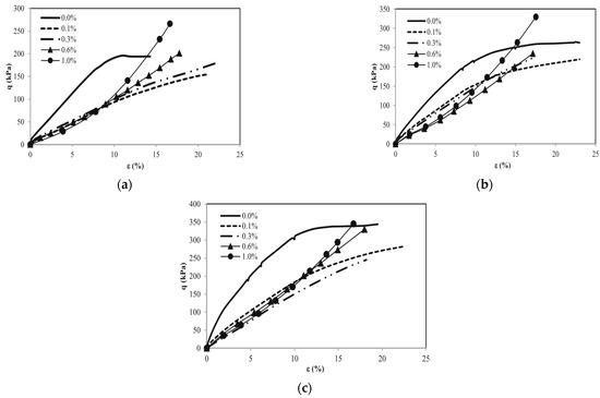 Stress–strain curves for: (a) σc = 61.85 kPa, (b) σc = 123.70 kPa, and (c) σc = 185.56 kPa. Reprinted from [70], Copyright (2023) with permission from Elsevier.