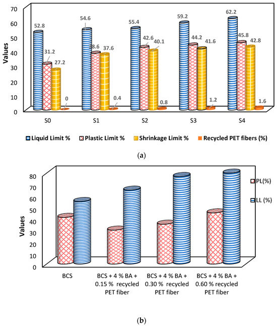 Variation caused by recycled PET fibers in liquid, plastic, and shrinkage limits of soil: (a) [14] and (b) [77]. Abbreviations: S0: soil sample with 0% PET fiber; S1: soil sample with 0.4% PET fiber; S2: soil sample with 0.8% PET fiber; S3: soil sample with 1.2% PET fiber; S4: soil sample with 1.6% PET fiber; BA: bagasse ash; BCS: black cotton soil.