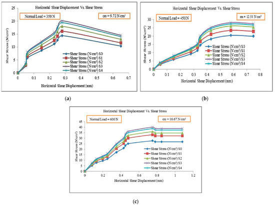 Shear stress vs. horizontal shear displacement at: (a) σn = 9.72 N/cm2, (b) σn = 12.50 N/cm2, and (c) σn = 16.67 N/cm2. Reprinted from [14], Copyright (2023) with permission from Elsevier.