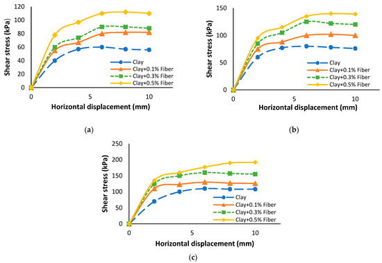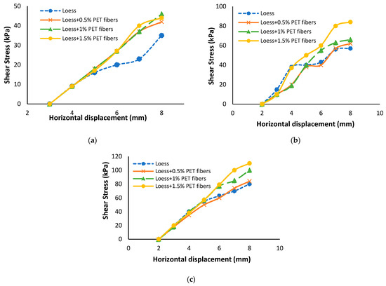 Interlocking between the particles of soil and the PET fiber surface plays a significant role in improving shear strength. Changizi and Haddad [72] observed that the inclusion of 0.5% recycled PET fiber resulted in a significant increase in the shear stress value from 111 kPa to 200 kPa when compared to natural clay. This increase signifies a remarkable enhancement in shear strength, amounting to an 80% improvement due to the addition of recycled PET fibers. Sarli, Hadadi and Bagheri [81] study found that the addition of 1.5% recycled polyester fiber increased the peak shear stress from 55 kPa to 121 kPa, resulting in a 53% increase in shear strength of soil as compared to natural loess. Moreover, when the fiber percent content is 0.5% and 1%, peak shear stresses increased by 14% and 29% in loess soil, respectively. However, at a higher fiber percentage of 1.5%, the rise in shear strength value was only 53%, as shown in Figure 8. Based on the stress–displacement behavior observed in Figure 9, it can be inferred that the peak strength of recycled fiber-reinforced clayey soil was generally reached at larger horizontal displacements compared to the unreinforced soil in most of the specimens examined [76]. The results of Kholghifard and Amini Behbahani [86] obtained from clayey sand were similar to the research of [76,87].