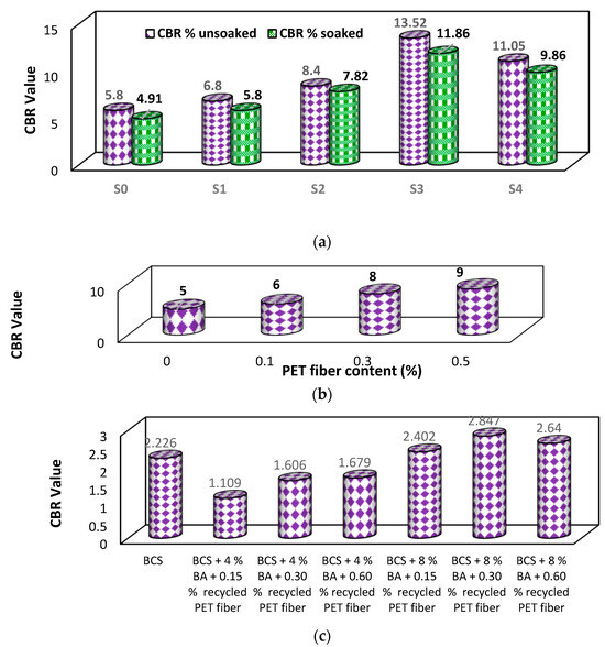 According to Mishra and Gupta [14], an increase in the percentage of recycled PET fibers leads to an increase in the CBR (California Bearing Ratio) value, as depicted in Figure 10a. The maximum CBR value is achieved at a fiber percentage of 1.2%. However, after this peak is reached, further increases in the PET fiber percentage result in a decrease in the value of the CBR, both for soaked and unsoaked conditions. The addition of recycled PET fibers in soil improves the CBR by enhancing the interfacial friction and reducing deformation, resulting in increased strength and performance. The results obtained by Changizi and Haddad [76] demonstrate that the inclusion of fibers leads to an increase in the CBR. The study further reveals that the CBR values show an upward trend with increasing fiber content up to 0.3%. However, as the percentage of fiber continues to increase beyond this point, the incremental improvement in CBR values diminishes, as shown in Figure 10b. Therefore, an increase in recycled PET fiber content has a significant impact on the CBR value of soil [88,89]. Arya, Patel, Bharti, Shukla and Hurukadli [77] revealed that the inclusion of 4% bagasse ash along with recycled PET fiber led to a reduction in the value of the CBR of black cotton soil (BCS). However, with a further increase in bagasse ash to 8%, the CBR value reached its maximum at 2.847 with a fiber content of 0.3%, as depicted in Figure 10c.