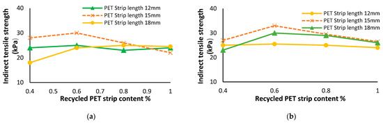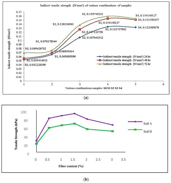 The addition of 1.2% recycled PET fibers in different soil types yields better performance. The addition of recycled PET fibers minimizes the formation of tension cracks through a bridge effect. The interfacial friction between recycled PET fibers and mix particles increases, leading to increased strength. However, when the PET fiber content exceeds 1.2%, the contact between the PET fibers and particles decreases, and fiber-to-fiber interaction becomes dominant, as shown in Figure 11a. This results in a reduction in strength, possibly due to the increased volume occupied by the fibers [14,87]. According to Tafti and Emadi [90], when the PET fiber content is increased up to 1.5%, there is an observed increase in the indirect tensile strength of poorly graded soils. However, beyond this fiber content, the strength begins to decrease with further increases in the PET fiber content, as shown in Figure 11b.