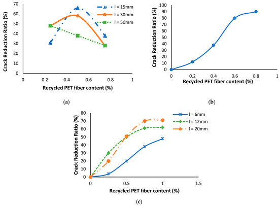 Variation in crack reduction ratio with different recycled PET fiber contents: (a) [80], (b) [99], and (c) [100].
