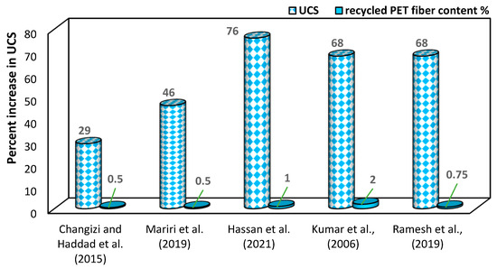Variation caused by recycled PET fibers in UCS value of soil [71,72,105,107,109].