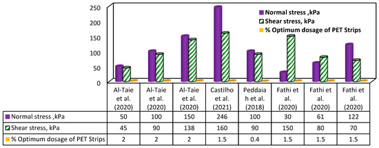The incorporation of recycled PET strips into soil has been found to affect the normal–shear stress characteristics of the soil, as shown in Figure 16 [124]. The presence of PET strips can enhance the soil’s shear resistance, leading to increased shear strength and improved stability [125]. In the study of Al-Taie, Al-Obaidi and Alzuhairi [87], the influence of incorporating 2% recycled PET fibers on the shear stress of poorly graded soil was investigated. The results showed that as the normal stress (σn) increased at a constant PET fiber content, the shear stress value of the poorly graded soil also increased. Castilho, et al. [126] conducted a similar study on both sandy and clayey soil, using a 1.5% recycled PET fiber content and σn value of 246 kPa. The findings indicated an improvement in the shear stress value of the soil. Peddaiah, Burman and Sreedeep [115] examined the effect of 0.4% PET strip content on sandy soil with a σn value of 100 kPa, while Fathi, et al. [127] studied the impact of a 1.5% PET strip fiber content on sandy soil with varying ranges of σn (30, 61, and 122 kPa) and observed a rise in the shear stress of the soil. This improvement is observed across different soil types and normal stress levels, suggesting that recycled PET strips can be a valuable solution for improving the properties of soils.