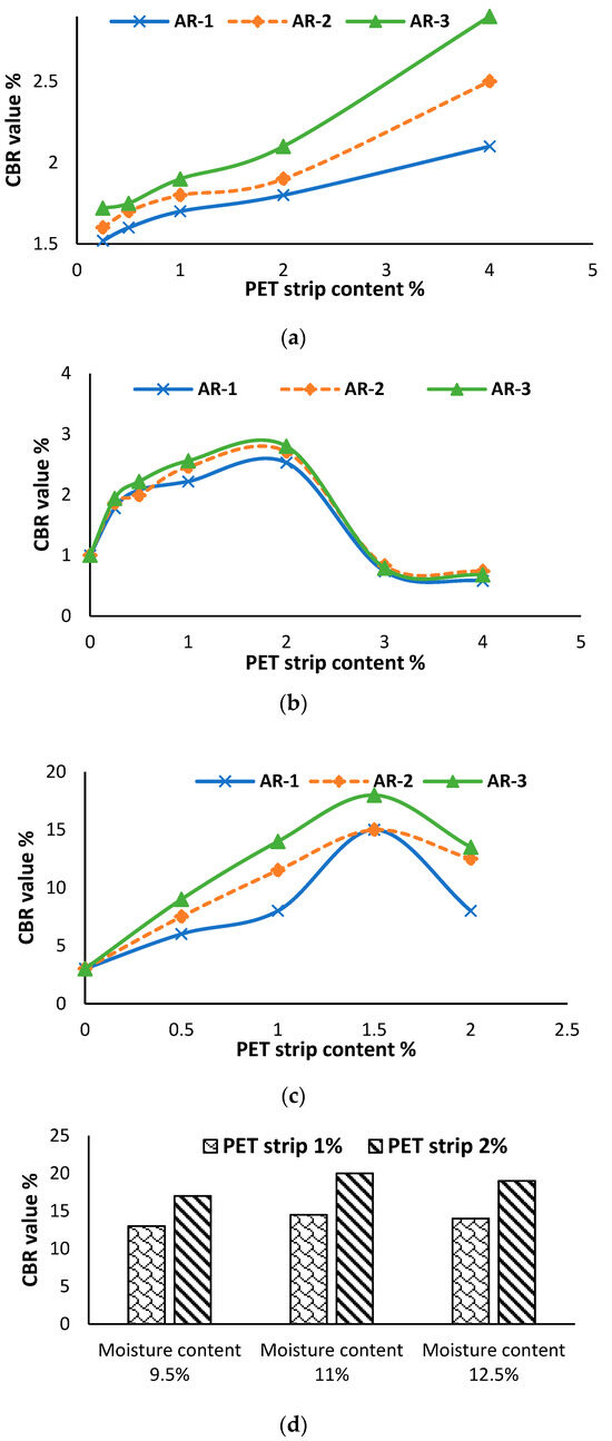 Figure 17a–c illustrate the highest enhancement in the CBR resulting from the inclusion of recycled PET strips by using the aspect ratios (ARs) of 1, 2, and 3, while Figure 17d shows the highest improvement in the CBR resulting from the inclusion of recycled PET strips with the moisture contents of 9.5, 11, and 12.5%. The maximum enhancement in the CBR was observed when utilizing 4% PET strip content with the ARs of 1, 2, and 3 [128]. Malicki, Górszczyk and Dimitrovová [83] conducted a study to investigate how moisture content and the addition of recycled PET strips impact the enhancement of the CBR. The highest CBR value was attained with 11% moisture content and 2% PET strip content. Sinha, et al. [129] stated that the highest CBR value can be achieved by incorporating 2% recycled PET strip content. However, the findings of Rawat and Kumar [130] suggest that a maximum CBR value is attained with 1.5% PET strip content at a penetration depth of 5 mm. Amena and Kabeta [119] conducted research to investigate how the inclusion of recycled PET strips and marble dust affects the CBR swell value of expansive soil. Amena and Kabeta [119] found that as the content of marble dust and PET strips increased, there was a noticeable decrease in the CBR swell value. According to the findings of Peddaiah, Burman and Sreedeep [115], an improvement in the value of the CBR was observed when the PET strip percent content was increased up to 0.4%. However, beyond this threshold, a decrease in the CBR value was observed. Niyomukiza, et al. [131] performed the CBR test on soil samples soaked for four days and noted an increase in the CBR value up to a recycled PET content of 0.3%. However, beyond this point, the CBR value started to decrease. Through analysis of sandy and clayey soil, Marçal, et al. [132] investigated the impact of recycled PET strips on the CBR value. Marçal, Lodi, Correia, Giacheti, Rodrigues and McCartney [132] observed a significant improvement in the CBR, from 27% to 47%, when using recycled PET strip content in sandy soil. In contrast, in clayey soil, the value of the CBR decreased from 20% to 18% with the use of recycled PET strips. Therefore, the use of recycled PET strips in soil can potentially affect the CBR value. Incorporating recycled PET strips into the soil can improve its strength and stability, resulting in an increase in the value of the CBR [133,134].