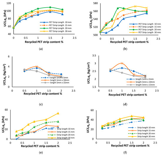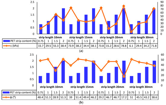 When considering the effect of PET strips on the dry density of soil, studies and research have shown that there is typically no substantial impact [115,122]. The addition of PET strips is primarily aimed at reinforcing the soil and improving its mechanical properties, rather than altering its density characteristics. Dry density is mainly influenced by compaction efforts, water content, and the soil’s particle size distribution [123]. PET strips, being lightweight and of relatively low volume compared to the soil mass, do not significantly contribute to changes in the overall density. Their presence may slightly affect the void ratio and porosity, but the overall impact on dry density is minimal. It is important to note that other factors such as compaction energy and compaction moisture content have a more significant influence on achieving the desired dry density.