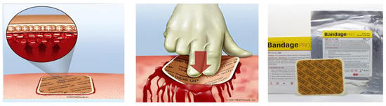HemCon dressings were the first patches to be approved by the FDA as hemostatic devices, useful especially in war zones. In fact, the marketing of this device in 2003 was initially mainly for US soldiers on the battlefields of Afghanistan and Iraq [37]. Indeed, there was a need in combat zones to provide a hemostatic product with direct pressure that could quickly control and stabilize hemorrhages that could not be treated with a simple tourniquet to ensure the transportation of wounded soldiers. The benefits obtained made it possible to extend the use of this patch to civilian use as well (Figure 1). However, the original formulation of the HemCon plaster was not suitable for the treatment of irregular and deep wounds due to its rigidity and for the treatment of smaller wounds without the danger of cutting or tearing [38]. In this regard, research has improved its pliability by adding a chitosan-based gauze roll that allowsit to be packed into wounds to ensure hemostasis through stimulation and platelet adhesion. Hence, new forms of HemCon® based on chitosanhave been developed, includingHemCon Patch® Pro, HemCon® Bandage, HemConChitoFlex®, HemCon® GuardaCare PRO, etc.
