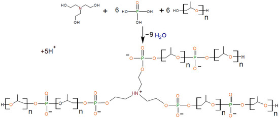 In [56,57,58,59], polyurethane ionomers were obtained using aminoethers of ortho-phosphoric acid (AEPA) as a polyol component. It was found that AEPA-PPG, synthesized using triethanolamine (TEOA), ortho-phosphoric acid (OPA), and polyoxypropylene glycol (PPG) with MM = 1000, is a branched structure that contains phosphate ions (Figure 1). The AEPA-PPG-PU with an ionomeric nature was investigated as a material for vapor-permeable and pervaporation membranes.