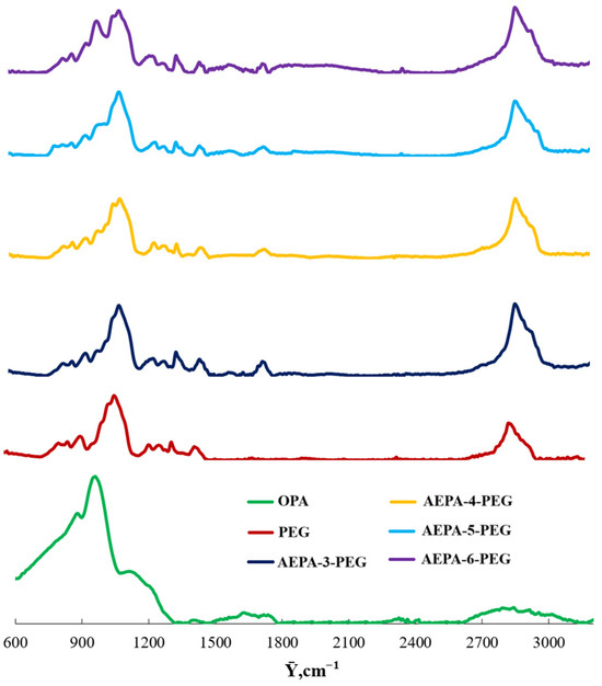 According to the analysis of the FTIR spectrum (Figure 2), in the TEOA-OPA-PEG system, ortho-phosphoric acid enters into an etherification reaction. Thus, high-intensity bands at 880 and 960 cm−1, corresponding to phosphate ions in the OPA composition, disappear, and bands appear at 950 and 1010 cm−1. The fact that OPA is practically absent in the composition of AEPA-(3–5)-PEG can be judged from the FTIR spectra.