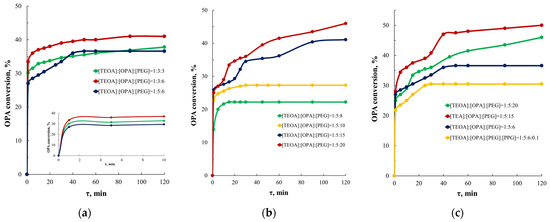 According to the data shown in Figure 3a, with a threefold molar excess of OPA relative to TEOA (curve 1, molar ratio [TEOA]:[OPA]:[PEG] = 1:3:3), the conversion of OPA is lower compared to the reaction system based on [TEOA]:[OPA]:[PEG] = 1:3:6. That is, an increase in the mole fraction of PEG leads to an increase in OPA conversion. For AEPA-5-PEG (curve 3), the conversion of OPA was lower compared to AEPA-3-PEG (curve 2).