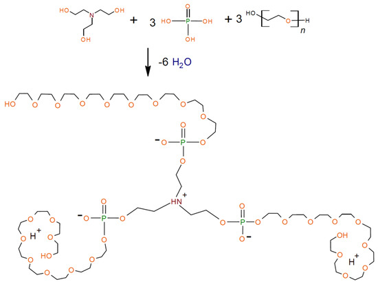 In [58], the role of associative interactions of tertiary amines and PPG in the catalytically activated low-temperature etherification of OPA was discovered and proven. According to our research [59], the use of PEG instead of PPG also makes it possible to synthesize the corresponding aminoethers of ortho-phosphoric acid (AEPA-PEG). This circumstance requires an explanation of the chemical processes that occur during the synthesis of AEPA-PEG.