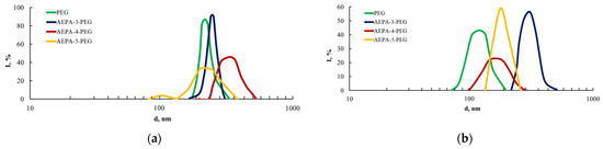 The particle sizes measured in water (Figure 5a) turned out to be the maximum for AEPA-4-PEG. The most likely reason for their relatively large sizes is the involvement of unreacted OPA in the associated interaction with AEPA-4-PEG. As a result, ortho-phosphoric acid remains in its structure and does not diffuse into the water. The size of AEPA-5-PEG, obtained with a higher content of OPA in comparison with AEPA-4-PEG, decreases due to the fact that part of the unreacted OPA ceases to be retained by associative interactions in the structure of AEPA-5-PEG and passes into the surrounding aqueous environment. Thus, the amount of ortho-phosphoric acid associated in the structure of AEPA-5-PEG does not exceed two molecules of OPA.
