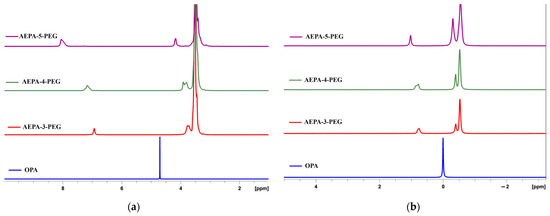 Further studies were carried out using 1H NMR and 31P NMR spectroscopy (Figure 6). The 1H NMR spectra for OPA show one narrow resonance signal on protons with a chemical shift δ = 4.7 ppm. (Figure 6a). For AEPA-(3–5)-PEG, the signal of the protons of the ortho-phosphoric acid groups shifts from δ = 7 ppm for AEPA-3-PEG and up to δ = 8 ppm for AEPA-5-PEG. For AEPA-4-PEG and AEPA-5-PEG, this signal expands due to its splitting. With an increase in the mole fraction of OPA during the synthesis of AEPA-(3–5)-PEG, a change in shape and a shift to a weaker field (by 0.5 ppm) of low-intensity resonance signals with a chemical shift δ = 3.7 ppm, corresponding to the proton, are also observed as part of the hydroxyl groups of PEG. According to the 1H NMR spectra analysis, phosphate ions in AEPA-(3–5)-PEG involve unreacted OPA molecules in associative interactions. The shift of the proton signal to the region of a weak magnetic field is most likely a consequence of their capture by the cavity formed by the open-chain analogue of crown ether, which is PEG, in accordance with the diagram shown in Figure 4.