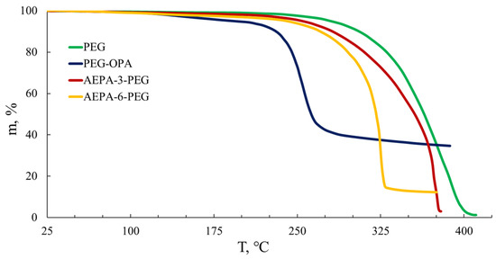 The results obtained correlate with the data of thermogravimetric analysis (Figure 7). Thus, the onset of the thermal decomposition of polyoxyethylene glycol occurs at around 275 °C. For a solution of OPA in PEG, obtained at the molar ratio [OPA]:[PEG] = 1:3, the onset of weight loss is observed at 158 °C, corresponding to the boiling point of OPA, and the beginning of intense mass loss corresponds to the temperature of thermal decomposition of OPA, located in the region 213 °C. Since the observed boiling and decomposition temperatures of OPA in the PEG medium correspond to the thermal characteristics of pure OPA, we can conclude that OPA exhibits relatively weak intermolecular interactions with PEG molecules. For AEPA-3-PEG (Figure 7, curve 3), the temperature of the onset of weight loss is slightly lower in comparison with PEG but significantly higher in comparison with the OPA solution in PEG. That is, due to the tendency of phosphate groups to strong associative interactions and the structural features of AEPA-PEG, the unreacted part of OPA is so firmly integrated into the structure of AEPA-3-PEG that the residual content of OPA does not evaporate and does not decompose when the boiling and decomposition temperatures of OPA are reached. For AEPA-6-PEG, the thermal stability begins to decrease due to the weak binding of part of the unreacted OPA to the structure of the amino ether of ortho-phosphoric acid.