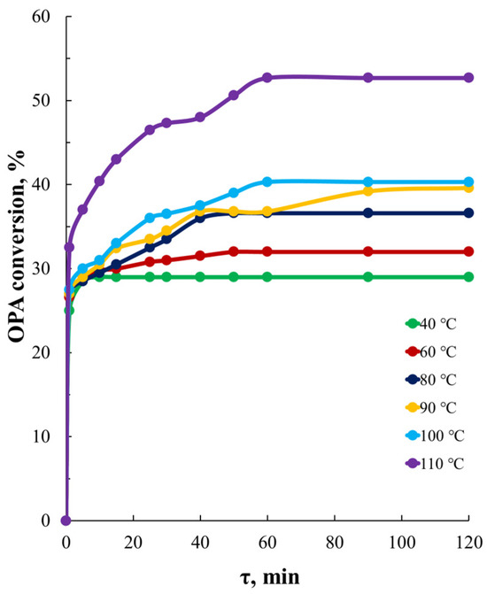 Figure 9 shows the time dependences of OPA conversion for the reaction system [TEOA]:[OPA]:[PEG] = 1:5:6 (AEPA-5-PEG), measured under different temperature conditions. It turned out that changing the temperature conditions from Tsynthesis = 40 °C to Tsynthesis = 100 °C leads to an increase in conversion from 29% to 40%. With a further increase in the synthesis temperature to Tsynthesis = 110 °C, the conversion of OPA already exceeds 50%.