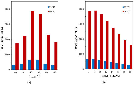 Vapor permeability coefficients for AEPA-5-PEG-PU based on AEPA-5-PEG, obtained at different synthesis temperatures (a) and for AEPA-5-PEG-PU depending on the molar ratio [PEG]:[TEOA], used in the synthesis of AEPA-PEG (b).