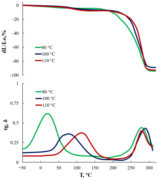 TMA and DMA curves (tg, σ) for AEPA-5-PEG-PU based on AEPA-5-PEG, synthesized at different temperatures.