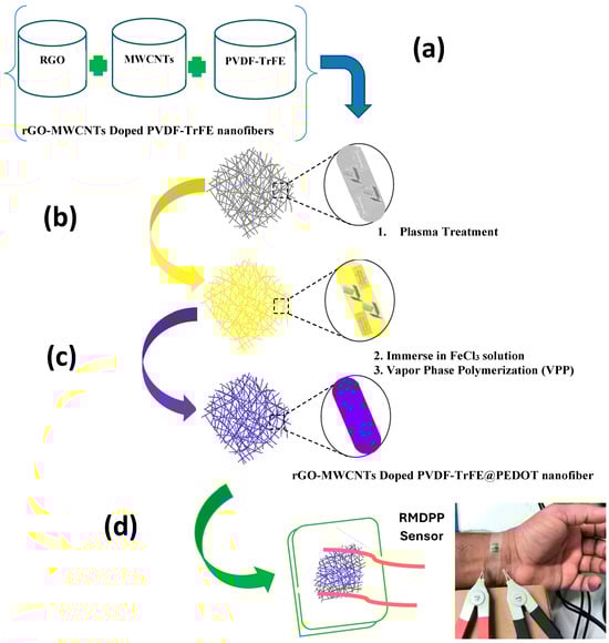 Schematic illustrations for fabrication of nano-fibers: (a) rGO, MWCNT, and PVDF-TrFE Solution; (b) Plasma treatment and coating of PEDOT via VPP; (c) rGO-MWCNTs-doped PVDF-TrFE@PEDOT nano-fiber; (d) Fabricated Pressure Sensor.