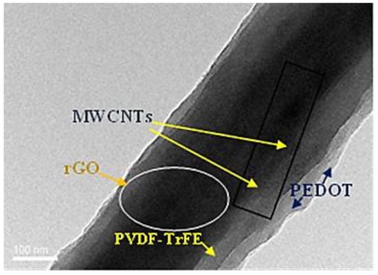 From the TEM image, it was found that the noticeable layer of PEDOT on the nano-fiber structure has an average thickness of ~296 nm. Additionally, rGO nano-sheets and multi-wall carbon nanotube MWCNTs inside the nano-fibers were not completely covered by the PVDF-TrFE polymer after electrospinning. However, the fibers were completely wrapped by the conductive polymer as a second layer using vacuum-phase polymerization (VPP), as demonstrated in Figure 3.