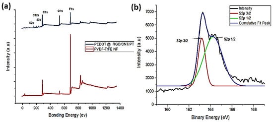 (a) XPS survey peaks (b) S2P spectrum of rGO-MWCNTs-doped PVDF-TrFE over PEDOT nano-fibers.