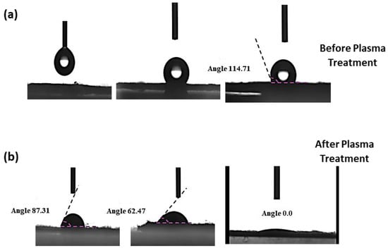 The developed nano-fibers were prepared and loaded with rGO-MWCNTs via a doping process within PVDF-TrFE nano-fibers. These fibers were subsequently subjected to low-temperature O2 plasma to introduce reactive functional sites, such as hydroxyl (OH) and oxygen-containing groups, onto the fiber surface. This synergistic effect could potentially alter the attributes of the nano-fiber mat from hydrophobic to super-hydrophilic. The change in surface modification after plasma treatment was confirmed by testing the water contact angle. The results indicate that the fibers showed a less or negligible water absorption phenomenon with a change in contact angle from 114.7° to 0.0° before and after plasma modification, as reported in previous works and can be depicted in Figure 5a,b. Therefore, the sufficient adsorption of the oxidant FeCl3.H2O results in speeding up the vapor absorption of the conductive polymer during VPP. However, the bonding that appeared among the PVDF-TrFE nano-fibers and conductive polymer PEDOT was improved by increasing the processing time [].