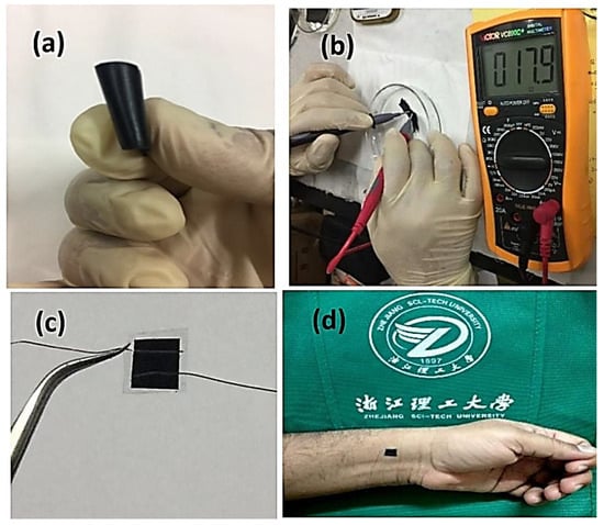 (a) Flexible pressure sensor (b) resistivity measurement by two-point probe manual ohms meter device and (c,d) a photograph of a fabricated sensor attached to the wrist of a subject.