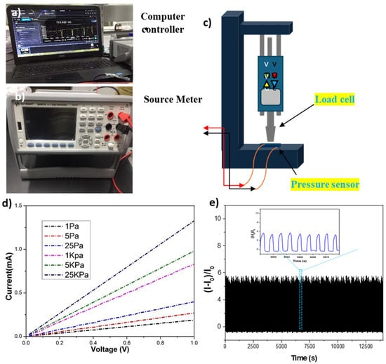 Experimental setup showing (a) PC controller (b) digital multi-meter (c) Mechanical set up for pressure load (d), I–V curves of developed pressure sensor under different pressure ranges (e) stability measurement record of repeated dynamic and static cycles at a frequency of 20 Hz and a pressure of 25 kPa.