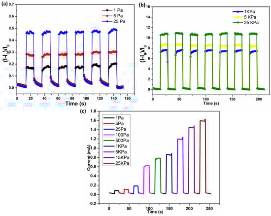(a,b) The relative output response of the sensor at very low to high pressure during the first 50–250 cycles, (c) the dynamic outcome at varied pressures of 1 Pa to 25 kPa at a constant voltage of 1.0 V.