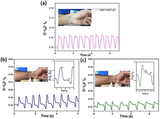 As demonstrated in Figure 10, by nature, the rest of the human body parts and the pulse rate were detected when placed on the human wrist, which indicates arterial pulse generation, which is commonly used for the measurement of blood pressure. The obtained signal response is a highly invaluable subject matter used for the continuous monitoring of human health conditions. In this work, keeping in view the considerations that the sensor is capable of detecting vital signs and could enable to detect or sense very small changes in wrist pulse with high sensitivity, as illustrated in Figure 10a–c. The subtle pressure changes are induced by heartbeats at the wrist pulse. The test results of two healthy subjects, A and B, were 24 years old, 169 cm in height, with a body weight of 54 kg, and 30 years old, 178 cm in height, with a body weight of 96 kg, respectively. Moreover, the prepared piezoelectric sensor has shown high sensitivity to detect very small movements; it could be used magnificently as a wearable E-Skin for prospective practical applications. The sample was attached to human skins employing a polyurethane film dressing (Tegaderm Absorbent, 2.5 M) for detecting subtle stimuli induced by pulse pressure, chewing, facial misexpression, speech recognition, and bending. It is also revealed from Figure 10c that subject B has three peaks (P1–P3), but for subject A there are only two peaks (P1 and P3) (Figure 10a–c). Typically, the wrist artery pulse waveform is found as P1 and P2, which are associated with early and late systolic pressure peaks, respectively, while the diastolic region typically defines P3. The arterial waveform is highly determined by the subject’s age under normal conditions, for example, by different age factors for children, young people, and elder persons, which may also be subjected to gender (Male/Female), healthy and unhealthy (sick) persons, respectively []. The heart rates of A and B are 84 bpm and 72 bpm (beats per minute (bpm), respectively. By attaching the sensor to the wrist, the wave signal changes [(I − I0)/I0] of the output current signal of the sensor. Furthermore, Figure 10a–c shows that the only obvious wrist pulse pressure signal is detected by the sensor, but the two subjects’ amplitude of the subtle pulse was differentiated between the subjects’ body conditions. These results further confirm that the wrist pulse rate frequency of a healthy subject A was 84 beats/min and B was 72 beats/min under normal conditions, respectively.