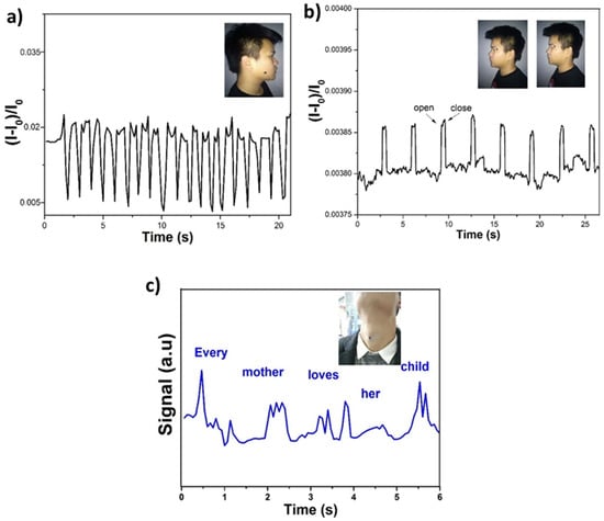 The device was then placed near the eye by detaching with polyurethane film as an adhesive masking tape to monitor the change in blinking expression, as demonstrated in Figure 11b. When an eye was blinked to open and close, the sensor responded instantly, and the relative current change [(I − I0)/I0] was observed. When observations were made during the blinking of an eye and variable states, i.e., closed and open eye state. Repetitive blinking of a change in the current signal response confirms that the sensor has admirable stability and repeatability. So far, few studies have been previously reported on wearable sensors employed in speech recognition and investigating the delicate muscle movement of the male subject during speech. The device was also attached to the throat to analyze the speaking behavior; as illustrated in Figure 11c, when the volunteer speaks a sentence, for example, “Every mother loves her child”, the pressure sensor exhibited distinct signal patterns, and these subtle pressure changes were induced as a result of complicated muscle movement of the throat. The trails of test performance further demonstrated that different pronunciations correspond to distinctive and repeatable wave signal patterns in each curve for each word. The results confirmed that the fabricated piezoelectric pressure sensor could provide a reliable and effective method for speech recognition and can potentially be used for different kinds of human activities due to its versatility and potential for biomedical applications.