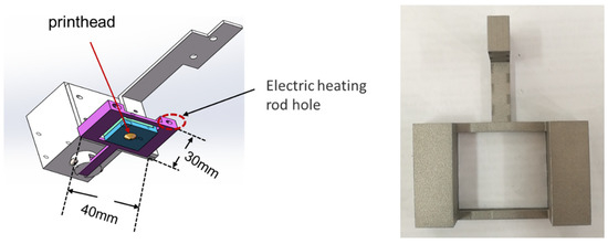 The multifunctional printhead is designed as a “fly swatter” structure and surrounds the printhead, as shown in Figure 2. The multifunction printhead includes the body printhead, impact compaction device, electric motor, and electromagnetic pulse controller. The device adopts an electric heating rod with a parallel structure and the corresponding temperature sensor, and the temperature of the electric heating rod is controlled by a micro-temperature controller to ensure the preheating effect of the impact device and uniform and stable preheating. The impact compaction device is used for the impact force size adjustment; an external digital dynamometer is also used for testing in the range of 0–5 N; the dynamometer is connected to the detection computer; the computer is utilized to operate the digital dynamometer through the software interface; and the test data are observed.