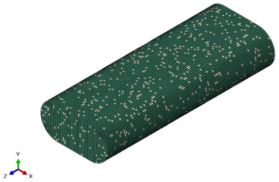 PEEK/short carbon fiber (CF) is a composite material reinforced with 10% chopped carbon fiber with a mixed volume fraction. The staple fiber is a strong anisotropic material, and the staple fiber is randomly mixed in the PEEK material. The model selects to print 5 mm microsegments as the analysis object. First, the discrete random algorithm is applied to discretize the short fibers into the model. Then, each short fiber is given random spatial direction in the model. Finally, the model is integrated for analysis. The model is shown in Figure 6.