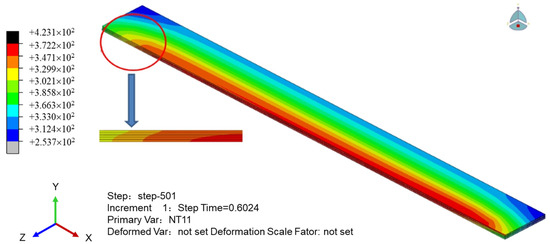 Figure 6 shows that the temperature of the sample during the printing process is the maximum near the printing terminus, and it diffuses radially to the periphery, which indicates a temperature gradient situation. During the printing process, the sample will absorb part of the heat due to the convection heat dissipation on the upper surface. As a result, the overall temperature of the sample tends toward the thickness direction of the ladder shape, and a trend of decreasing layer by layer is observed.