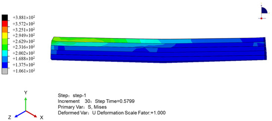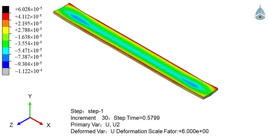 To obtain the relationship between the internal stress and temperature of the printed sample, we simulate the stress cloud and the displacement cloud in the thickness direction of the sample, as shown in Figure 8 and Figure 9, respectively. Figure 8 shows that the stress of the sample near the printing end lane is minimal; it decreases to the perimeter of the printing termination, and the overall stress field is an inverse wave layer. As shown in Figure 9, the stress of the sample is affected by the temperature field. The temperature of the upper surface of the sample drops sharply, the stress gradually increases, and the upper part of the sample shrinks with the increase in time. Meanwhile, the middle and bottom surface of the sample have heat conduction due to the printing process, the temperature drops slowly, and the internal stress changes slowly with the temperature. In general, the warpage around the upper part of the molded part changes the most, and the deformation of the sample is concave.