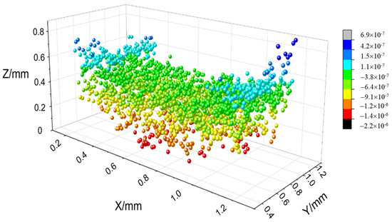 The stress field value of the PEEK/CF composite is obtained by extracting the nodal displacement of the bottom surface in Figure 10, to obtain the intuitive warpage deformation characteristics of the sample. The figure shows that the fiber-reinforced PEEK material is scattered with the discreteness of the spatial position of the chopped fiber due to its mixing characteristics. The overall microsegment stress is uneven, and the interface stress between the fiber and PEEK material is greater and shows stress concentration. The two stress field distributions caused by material and temperature have different characteristics of bottom warpage, and the fiber-reinforced PEEK material with a large internal stress has a large amount of warpage deformation.