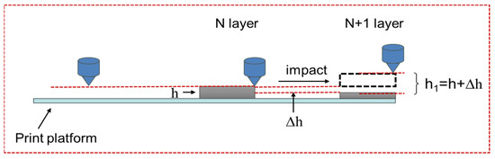 This study establishes a model for the influence of the height change from the printhead to the forming layer on the interlayer performance, as shown in Figure 13, to understand the reasons for the degradation of the interlayer performance of samples after impact. For the design printing process parameters, the printing layer height is h. After the impact, the layer height thickness is reduced . When the next layer is printed, the originally designed layer height h now becomes . The printing layer height increases. Thus, the interlayer shear strength decreases.