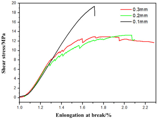 A comparative experiment is designed in this section to study the influence of printing layer height on the interlayer performance of additive manufacturing of PEEK/CF composites for verifying the effect of the change in printing layer height on interlayer performance. Different layer heights of 0.1, 0.2, and 0.3 mm of FDM are designed, and the results are shown in Figure 14.
