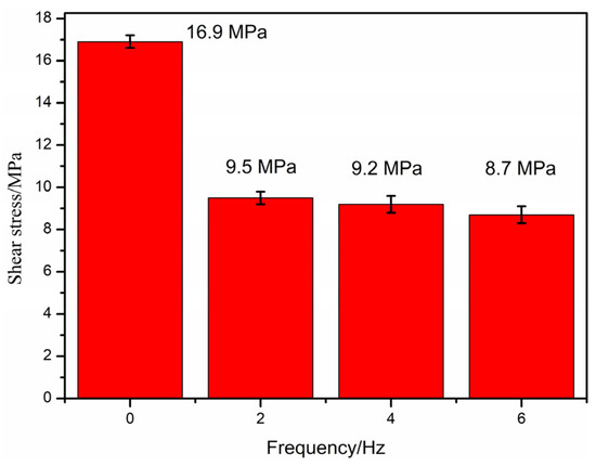 Different impact frequencies (0, 2, 4, and 6 Hz) and preheating temperatures and impact strengths of 350 °C and 0.3 N, respectively, are designed in this section to study the influence of different impact frequencies on the interlaminar shear strength, as shown in Figure 16, for exploring the influence of the impact frequency on the interlaminar performance. The figure shows that the interlayer shear strength of the blank sample is 16.9 MPa, and the interlayer shear strength of the sample after impact is lower than that of the blank sample.