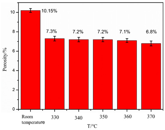The influence of the preheating temperature on the porosity of PEEK/CF composites is studied when the design impact strength is 0.3 N and the impact frequency is 6 Hz. The influence of different preheating temperatures on the porosity of the formed samples is obtained. The results are shown in Figure 18. The figure shows that the porosity of the FDM samples of the PEEK/CF composite gradually decreases from 10.15% to 6.83% with the increase in preheating temperature. This result is due to the fact that the molecular segment movement of PEEK resin is more violent when the temperature is higher, and the gaps between the layers and the porosity of the material are lower when it is easier to compact under the action of an impact hammer. Therefore, preheating treatment during the printing process can reduce the porosity of the formed sample of the PEEK/CF composite.