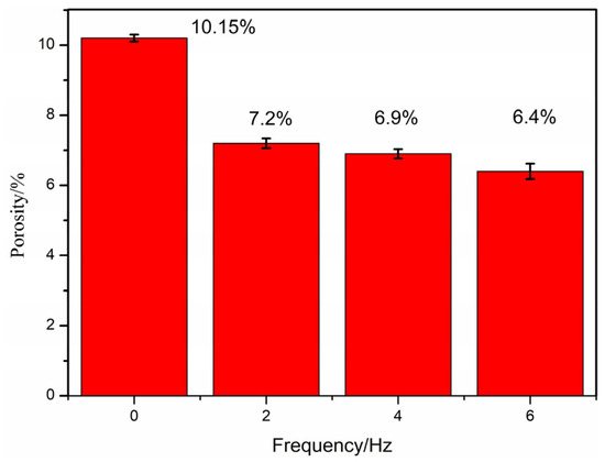 The influence of different impact frequencies on porosity is studied with a preheating temperature of 350 °C and an impact strength of 0.3 N. The test results are shown in Figure 18. The figure shows that the porosity of the fused sedimentary samples of PEEK/CF composites (from 10.15% to 6.67%) gradually decreases with the increase in impact frequency. This result is due to the fact that the preheating temperature is constant, the PEEK/CF composite is easier to compact, and the porosity of its interlayer gaps and materials is lower when the impact hammer acts on the freshly printed sample more often. Therefore, the high impact frequency can reduce the porosity of the formed samples of PEEK/CF composites.