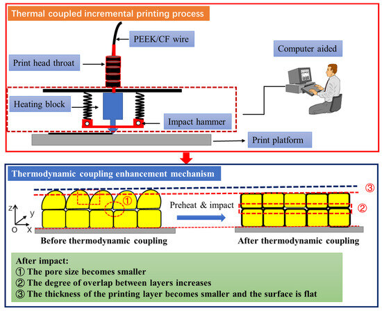 Previous studies have shown that the heat treatment temperature is higher than the glass transition temperature of PEEK thermoplastic material, PEEK shows high elastic characteristics, and the molecular chain segment has strong movement ability, which can effectively release the residual stress originally “sealing” in the matrix [18]. Therefore, the heat treatment process can reduce the maximum residual stress value of the fused deposition-forming sample, and the forming process of the PEEK/CF composite material needs to be heat treated. Therefore, we designed a multifunctional printhead to realize the forming process of preheating, printing, and impact compacting and expect to achieve the integrated forming of preheating, printing, and impact for improving the forming quality of the sample.