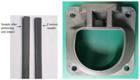 The system integration of a 3D printer based on a preheating and stamping device is completed, and a 3D printing experiment of carbon fiber-reinforced PEEK composite is conducted. The sample printing before and after preheating and shock is obtained as follows: Figure 20 shows that the sample without impact has a rough surface, and the surface has obvious ravines “plowed” by the printhead. After preheating and impact, the surface of the sample is relatively neat, which shows that the surface quality of the formed sample can be effectively improved by the preheating and impact process.