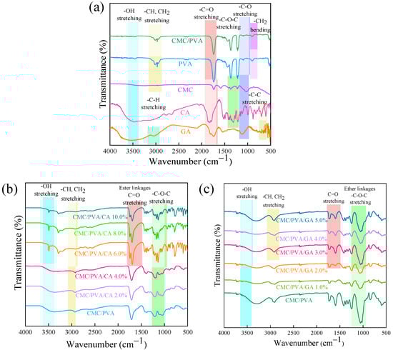The effect of the crosslinking of CA and GA on the chemical functional groups of CMC/PVA hydrogel films (Scheme 1) was analyzed using FT-IR spectroscopy over the wavenumber range of 500–4000 cm−1. Figure 1a illustrates the predominant functional group components of CA, GA, CMC, PVA, and CMC/PVA from the FT-IR spectra, highlighting carboxyl, hydroxyl, and hydrocarbon chemical functional groups, as summarized in Table 1. Additionally, Figure 1b,c depicts the chemical functional groups of CMC/PVA hydrogels, demonstrating the enhanced crosslinking structure with the addition of CA and GA additive agents, respectively. The overall functional groups of CMC/PVA hydrogel films and their modified conditions are presented in Tables S1 and S2.