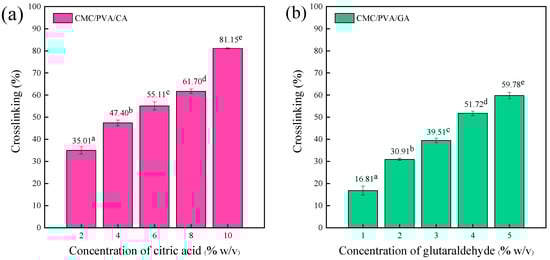 Crosslinking percentage from the measurement of (a) CMC/PVA/CA and (b) CMC/PVA/GA hydrogel film conditions.